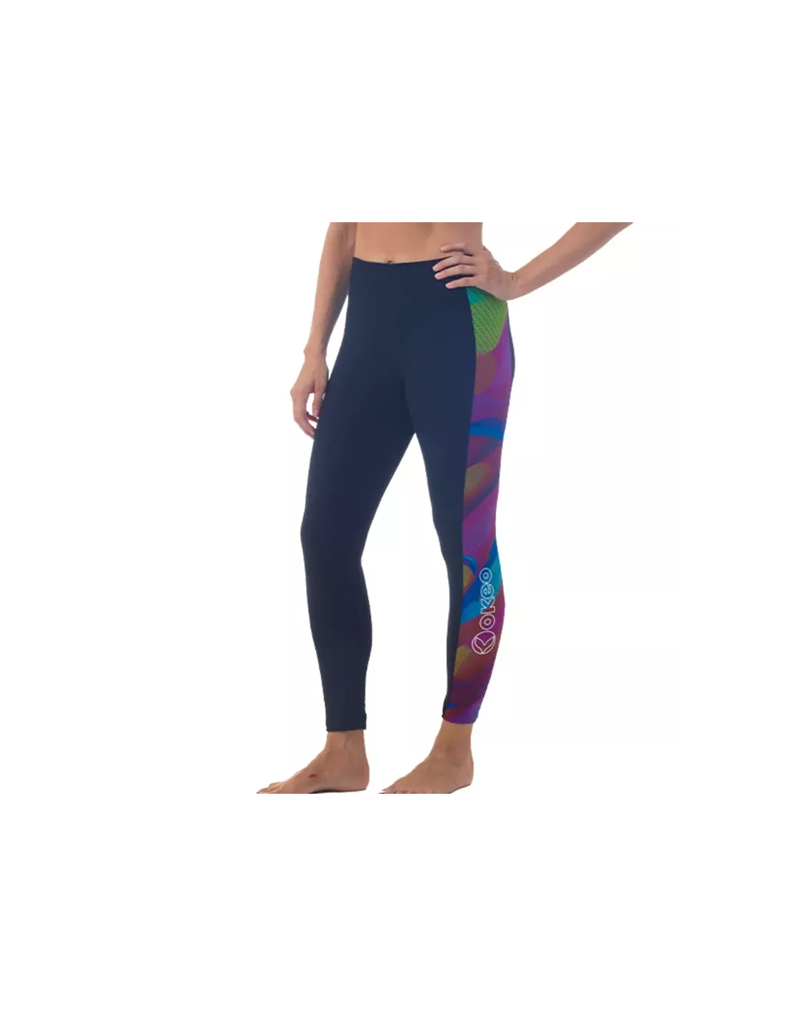 Die tiefblaue Farbe wird durch ein gemustertes Seitenband hervorgehoben, das dem Kleidungsstück eine originelle Note verleiht und die Silhouette schlanker wirken lässt. Der Bund sorgt für Halt und Stabilität und macht dieses Modell ideal für sportliche Aktivitäten und Freizeit.