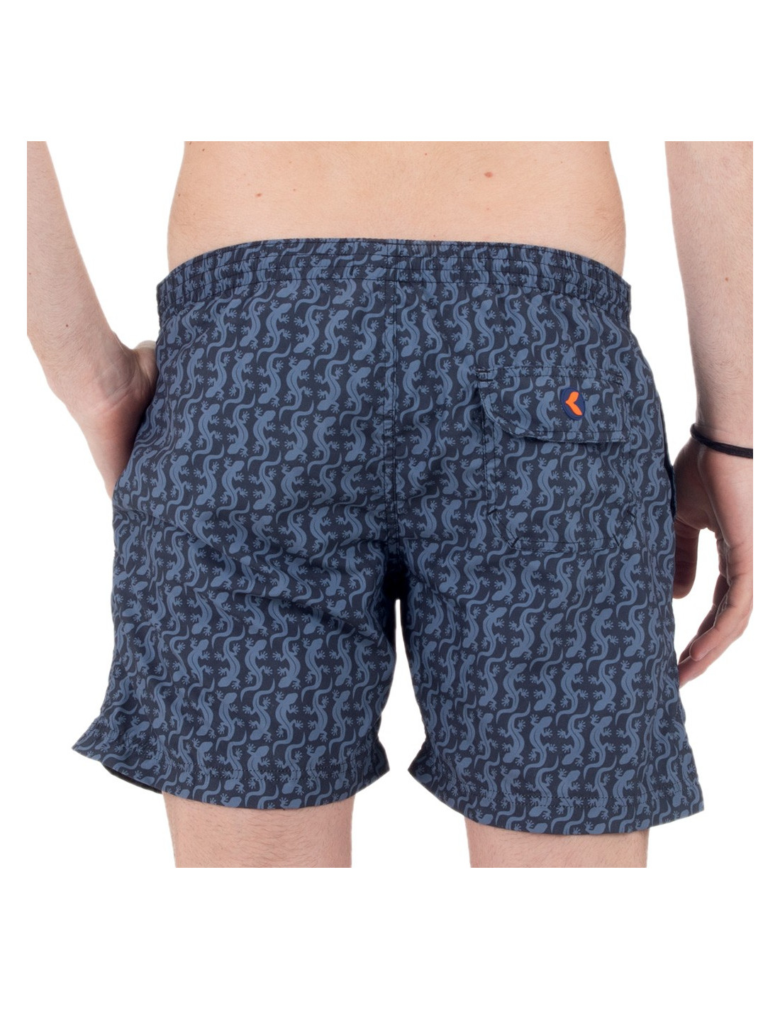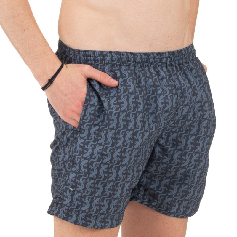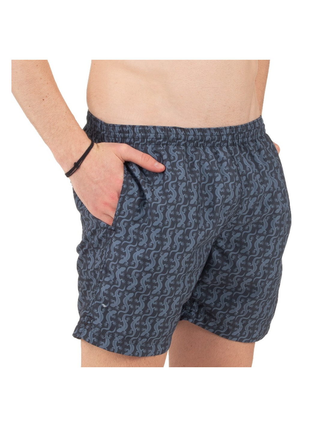 Produktcode: A31025Herren-Badehose mit Seitentaschen und Gesäßtasche. Innenliegendes Mesh-Gewebe. Gecko-Muster auf grauem Hintergrund. Schnelltrocknend!