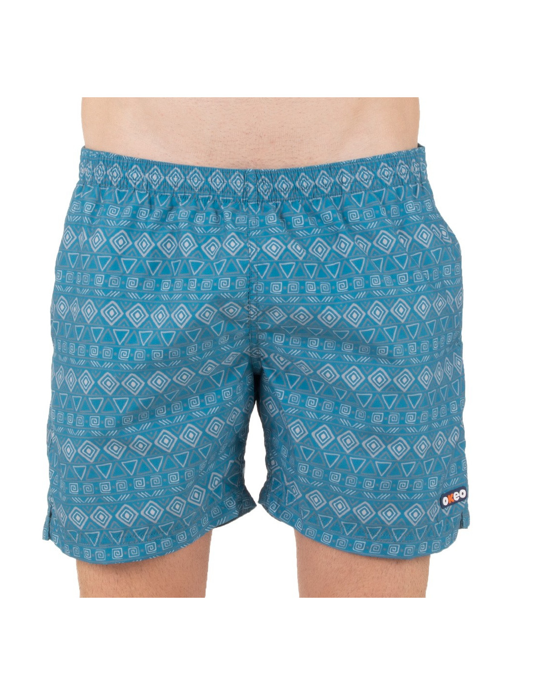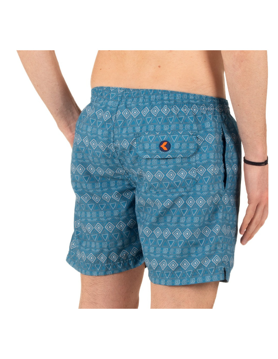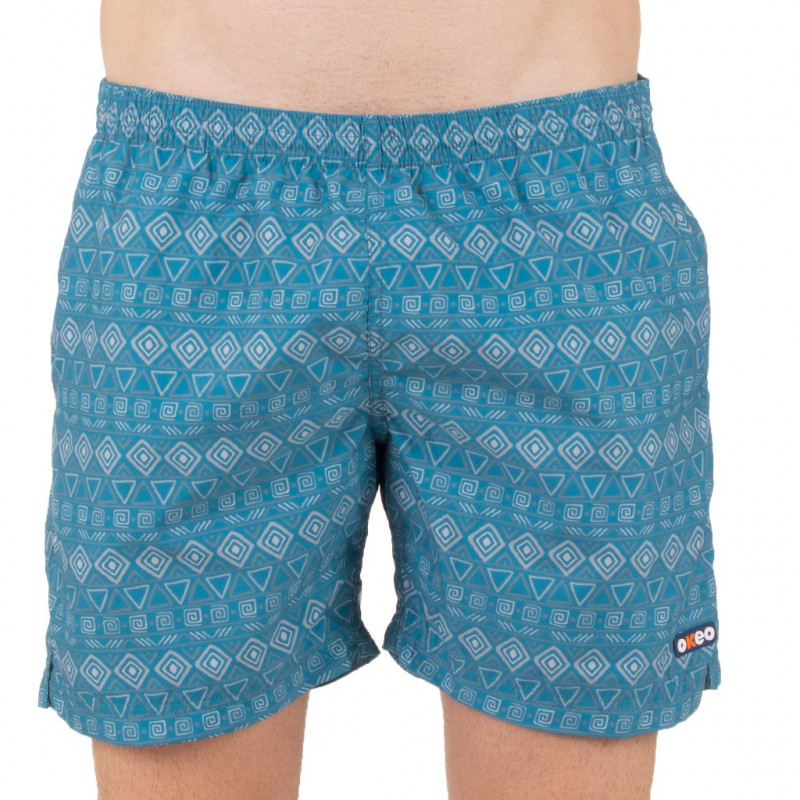 Herren-Badehose mit Seitentaschen und Gesäßtasche. Innenliegendes Mesh-Gewebe für optimale Unterstützung. Grafikprint auf mattblauem Hintergrund. Schnelltrocknend!