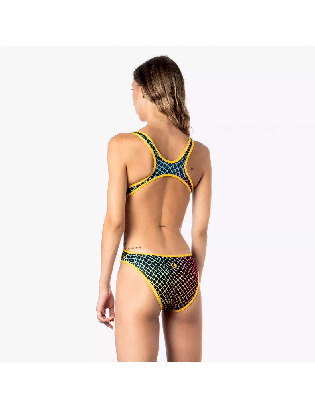 Produktcode: A00007Der einteilige Damen-Badeanzug CADIZ mit buntem Muster und gelbem Saum ist aus chlorbeständigem Funktionsmaterial gefertigt. Er bietet eine besonders schmale Passform, breite Träger und ein Innenfutter für optimalen Halt und Komfort beim Training.