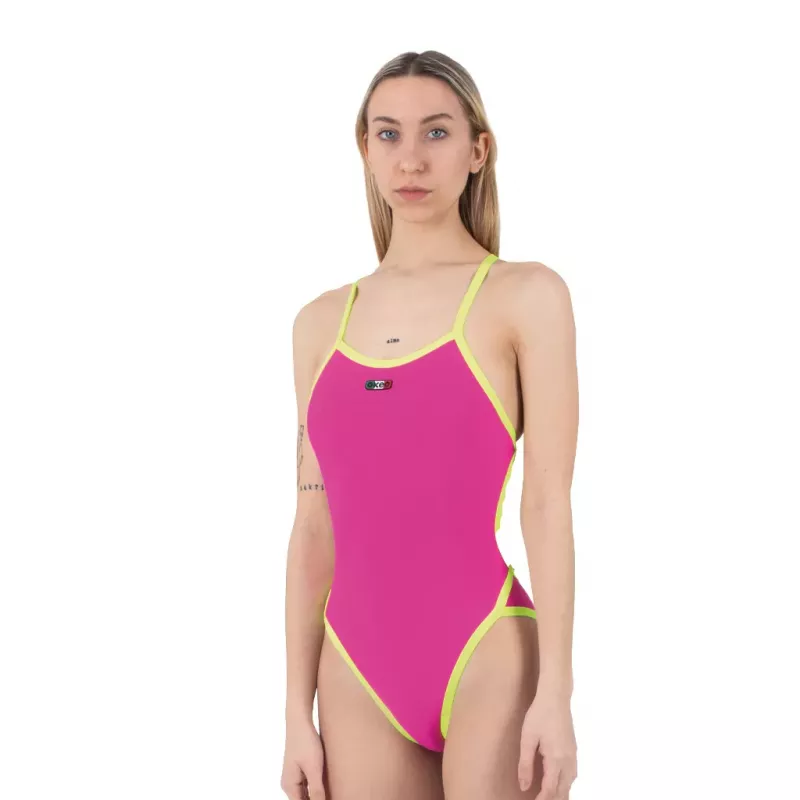 Der DAKI-Einteiler vereint Eleganz und Komfort mit einem einfarbigen Grafikmuster und farbigen Ziernähten und ist in vier edlen Farben erhältlich. Ideal für stilvolles und vielseitiges Schwimmen.