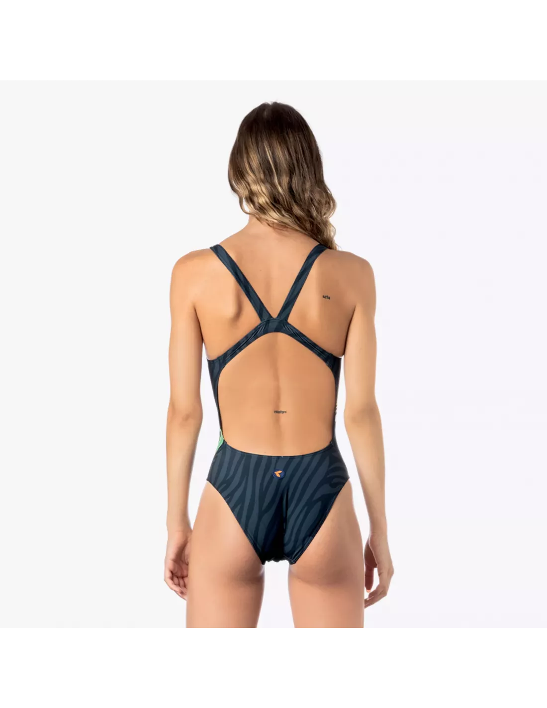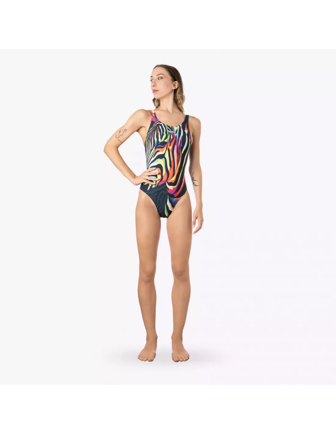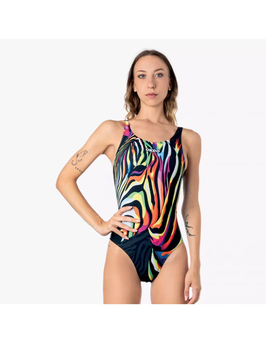 Der farbenfrohe Zebraprint verleiht ihm einen dynamischen und auffälligen Look – perfekt für alle, die auch im Wasser auffallen wollen. Die breiten Träger sorgen für Halt und Komfort bei jedem Training, während das Innenfutter für optimale Abdeckung und angenehmen Tragekomfort auf der Haut sorgt.