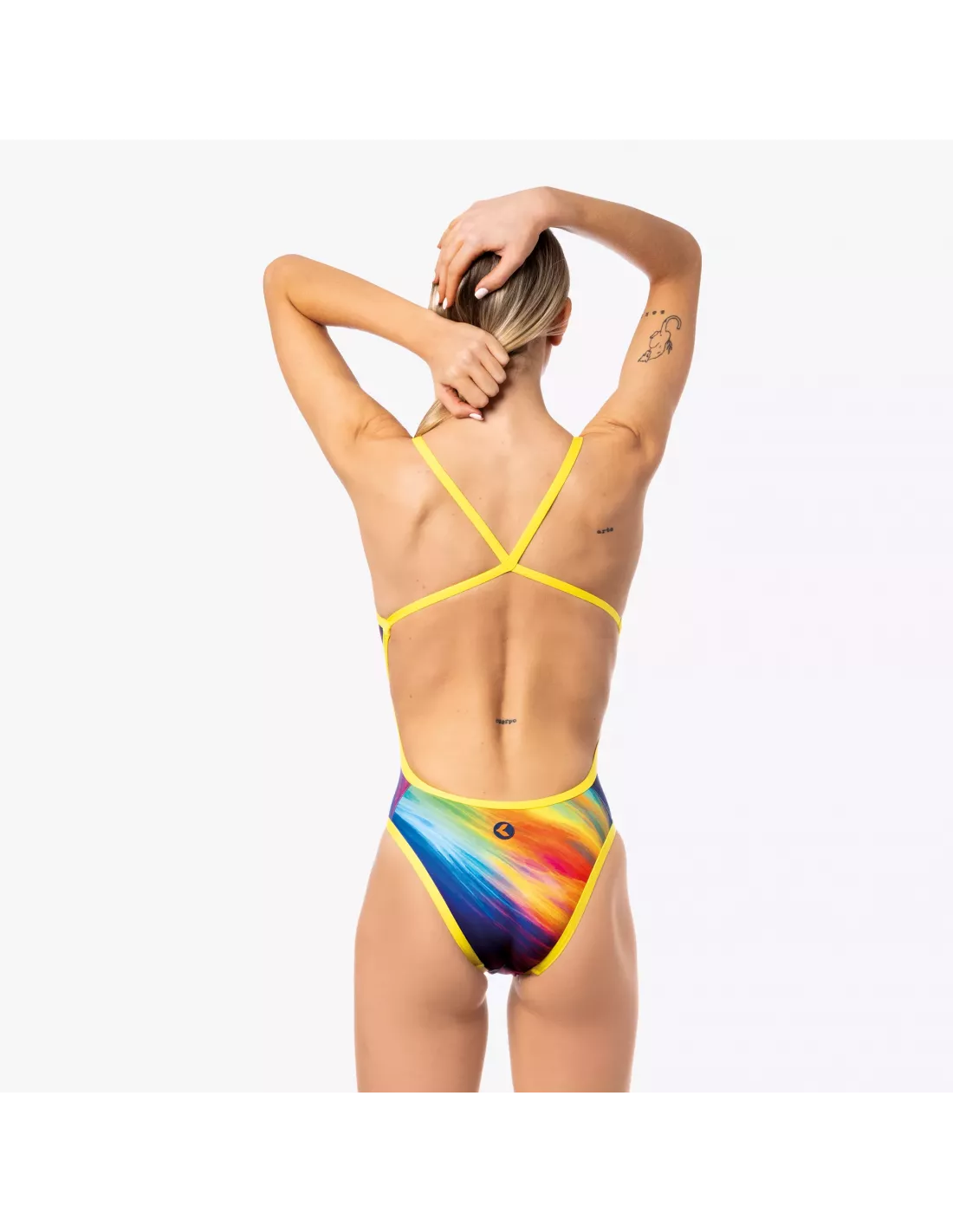 Der Damen-Einteiler MIXER vereint Stil und Funktionalität mit strapazierfähigem X-PLAY-Material, dünnen gelben Trägern und einem lebendigen Muster. Er ist perfekt zum Schwimmen und Trainieren geeignet und garantiert Komfort und Bewegungsfreiheit.