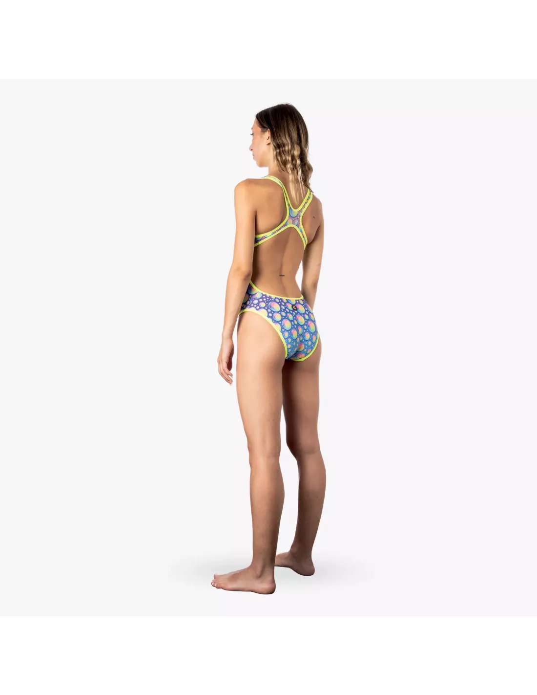 Der einteilige Badeanzug BOLLE für Damen vereint Stil und Komfort mit einem Blasenmuster auf hellem Hintergrund, breiten Schulterträgern mit gelbem Besatz und chlorbeständigem X-Play-Gewebe.