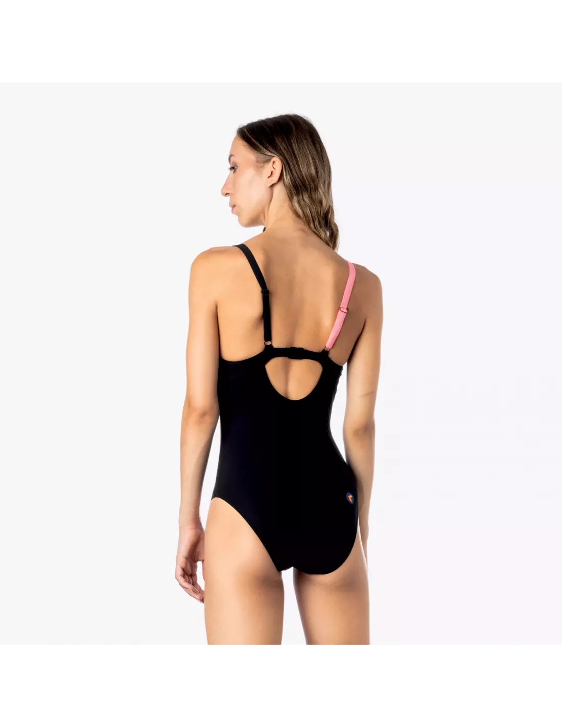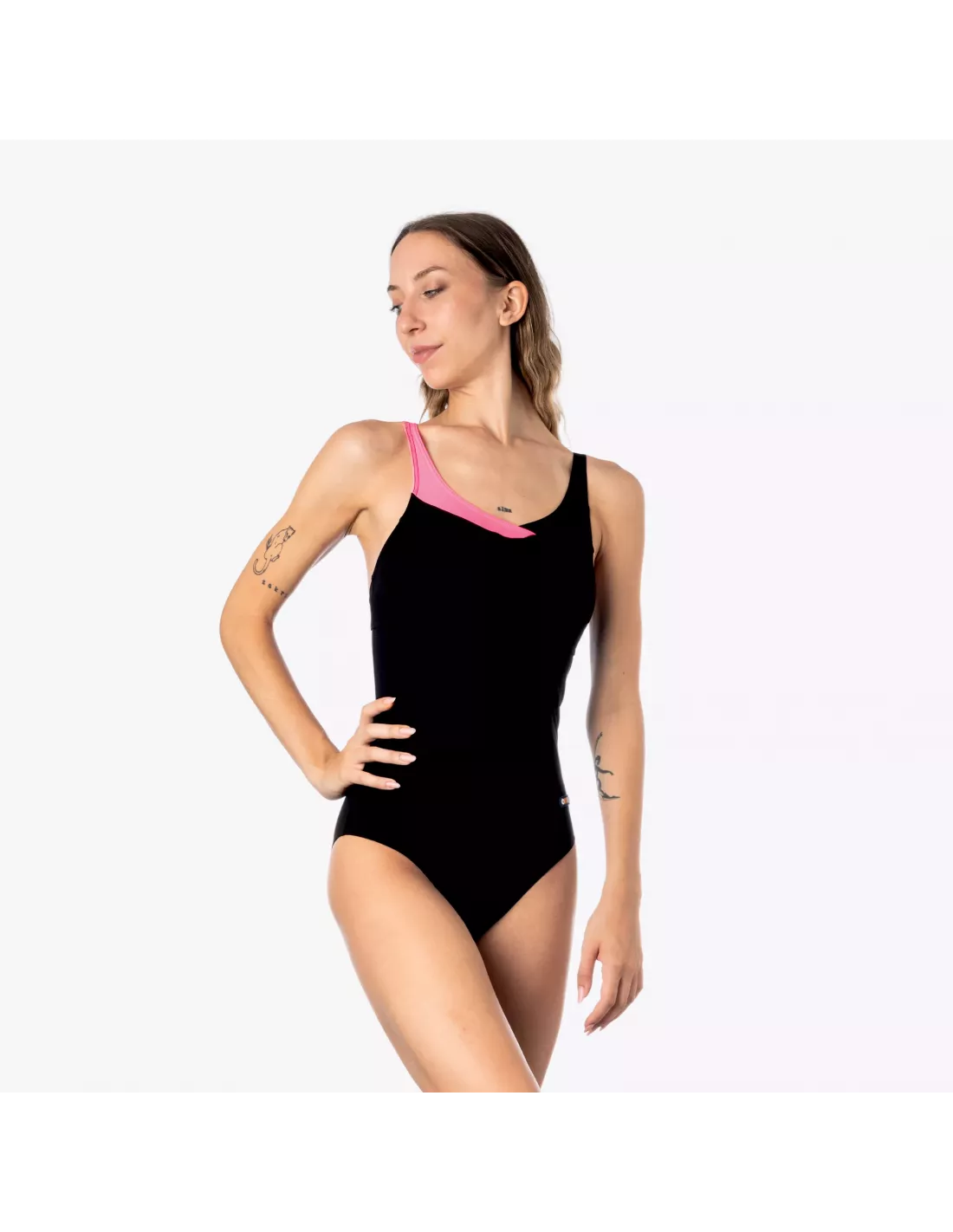 Der einteilige Badeanzug MAY vereint Eleganz und Komfort und ist ideal zum Schwimmen und fürs Pooltraining. Das schlichte Schwarz mit dem dezenten pinkfarbenen Band formt die Silhouette und sorgt für maximale Bewegungsfreiheit.