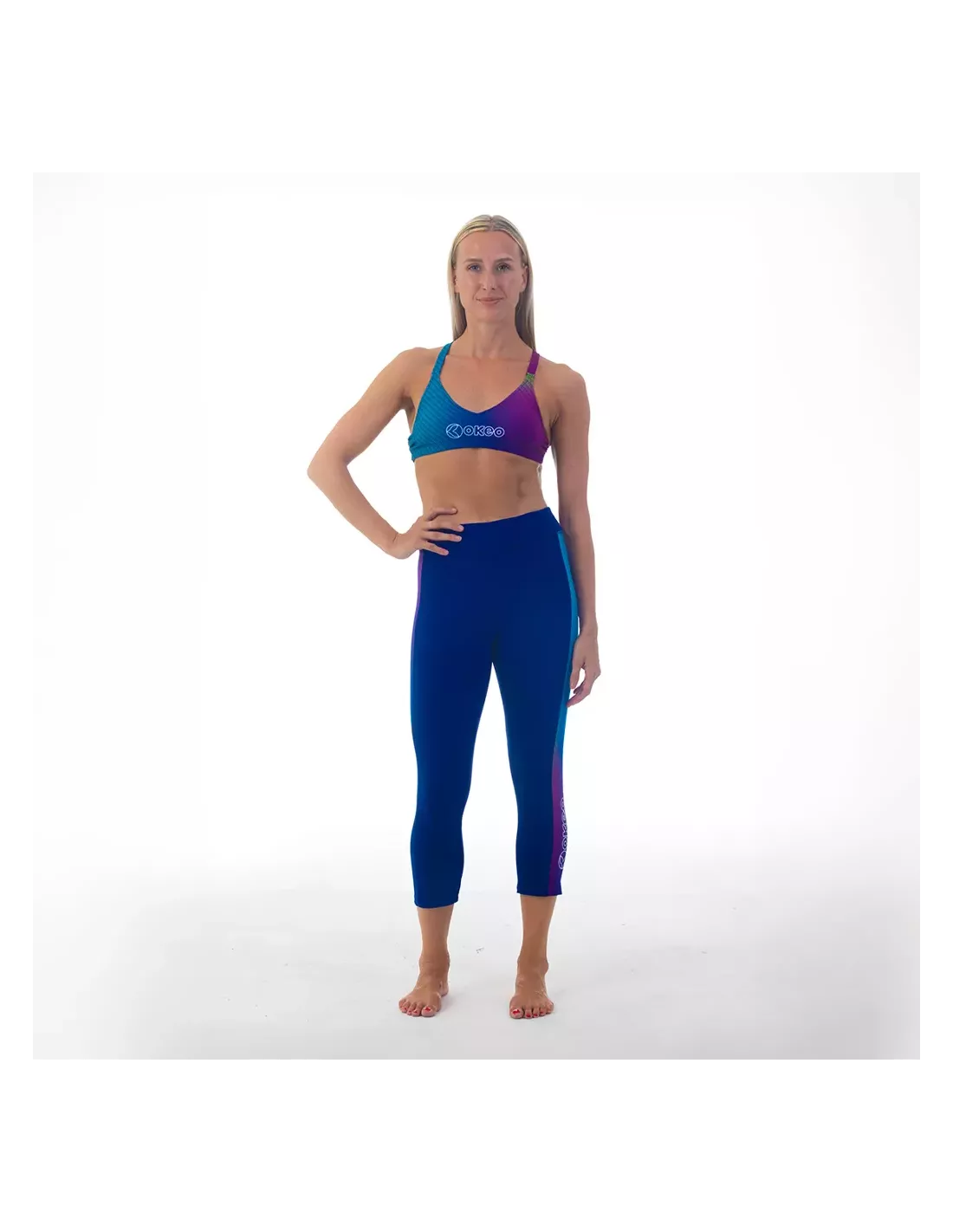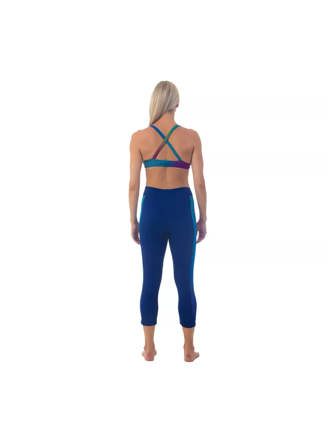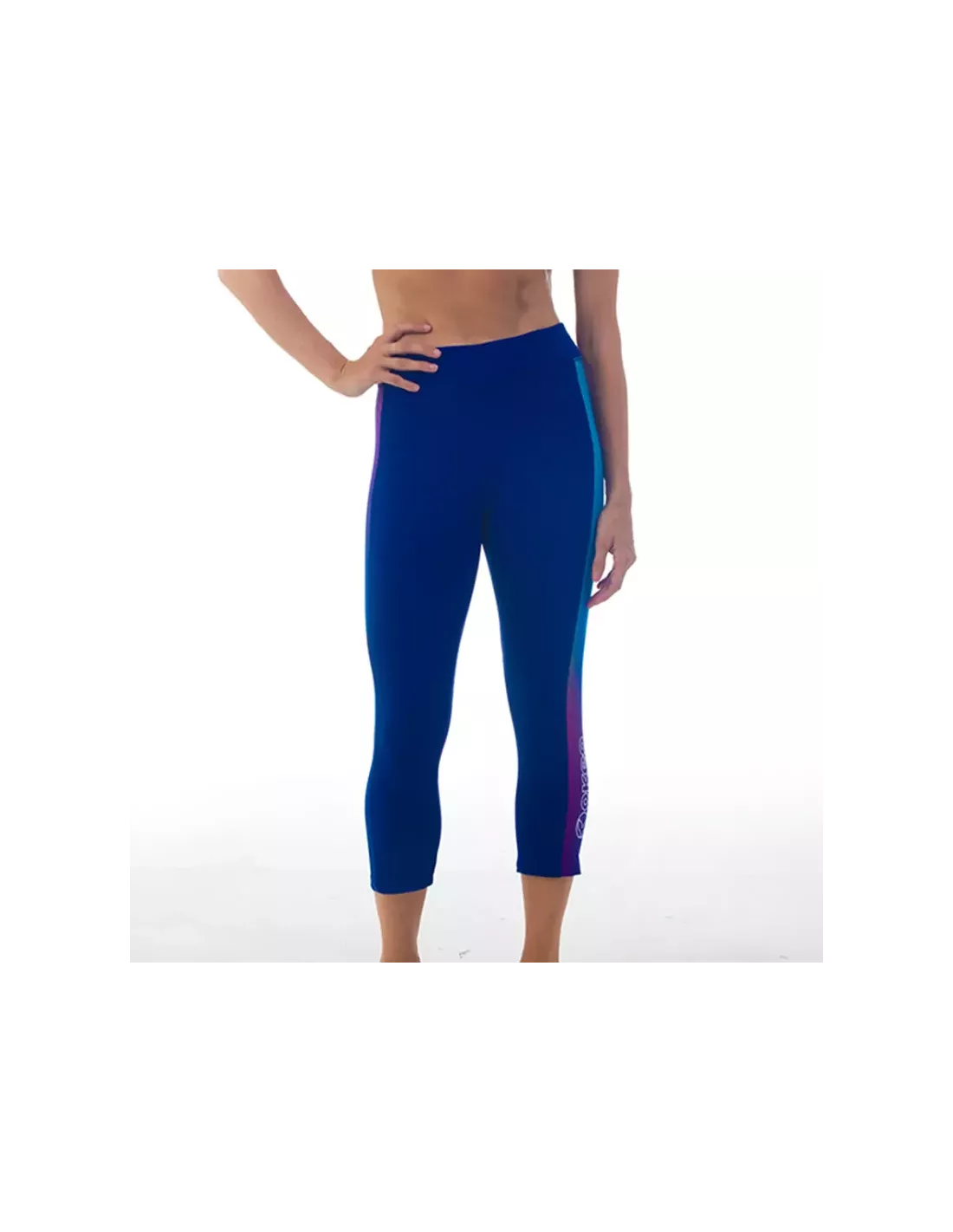 Kurze Damenleggings in IVORY , gefertigt aus weichem Polyester und Elastan, in Blau mit einem eleganten, gemusterten Seitenstreifen. Dank des bequemen Bundes und der optimalen Passform sind sie ideal für Sport und Freizeit.