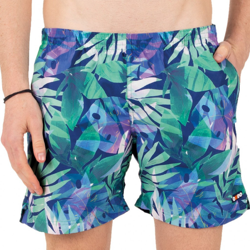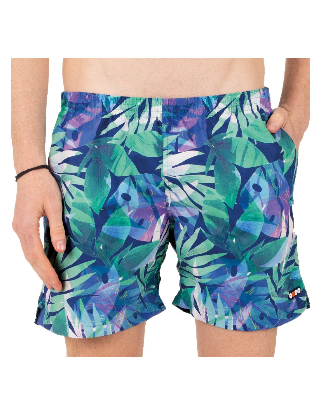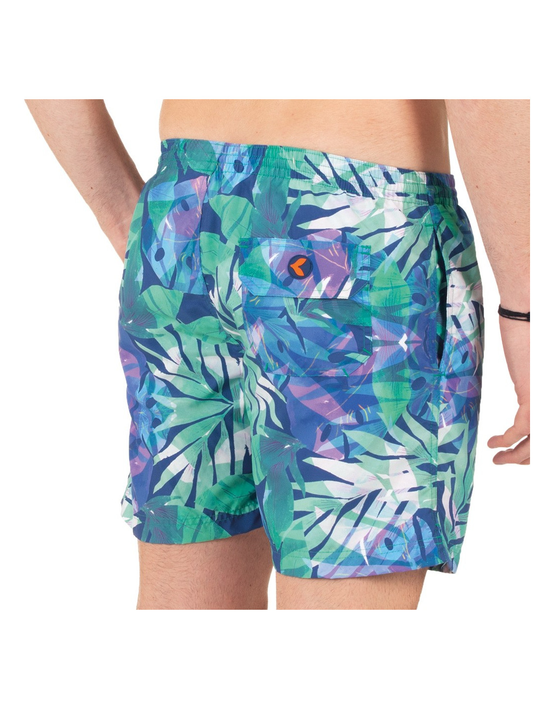 Herren-Badehose mit Seitentaschen und Gesäßtasche. Innenliegendes Mesh-Gewebe für optimale Unterstützung. Tropischer Print auf aquagrünem Hintergrund. Aus schnelltrocknendem Polyester.