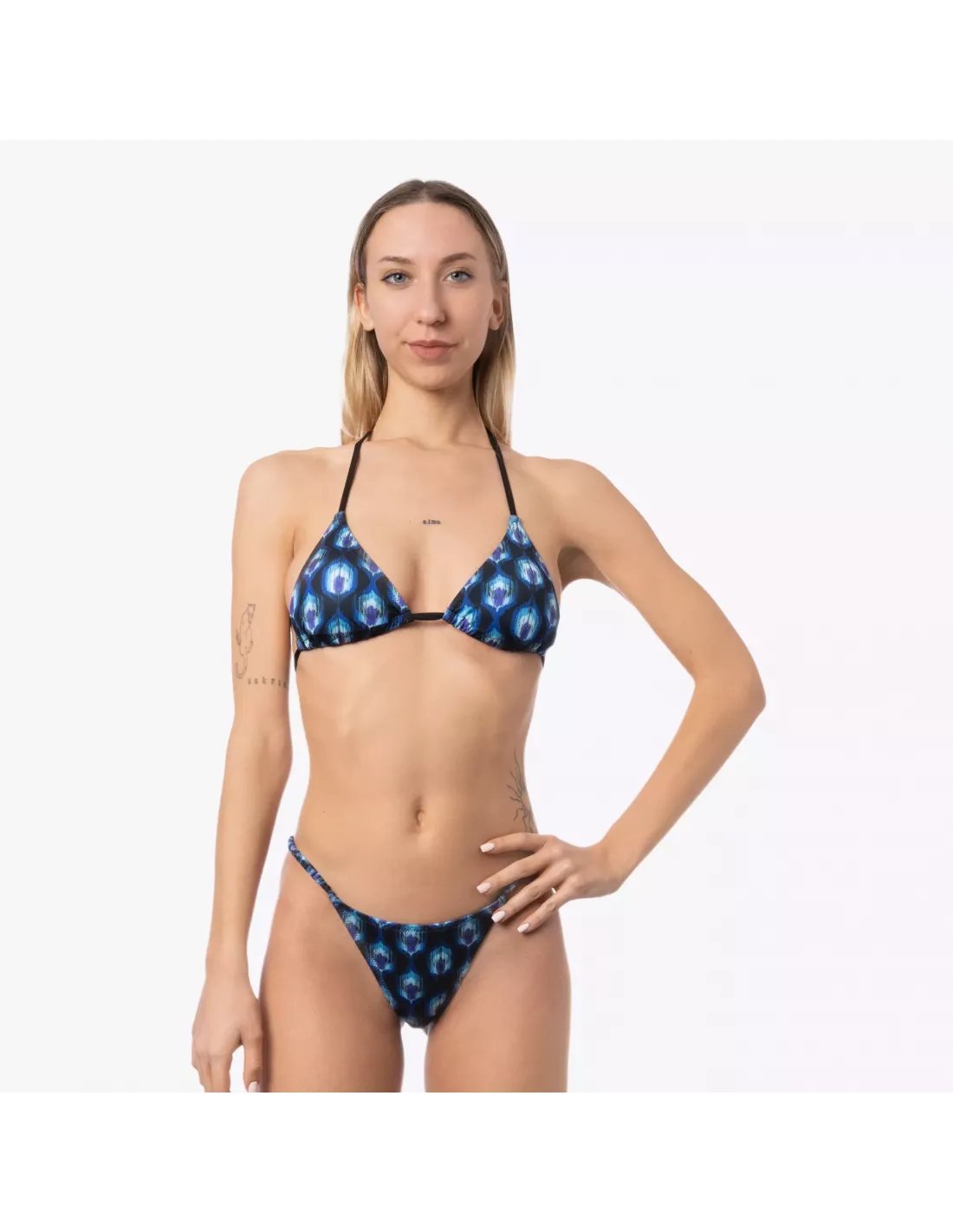 Der IONIO-Bikini mit Triangel-Schnitt und Pfauenmuster ist in elegantem Dunkelblau erhältlich und verfügt über herausnehmbare Cups für eine individuelle Passform. Zusammen mit dem passenden Sarong ist er die ideale Wahl für alle, die am Strand Wert auf Stil und Komfort legen.