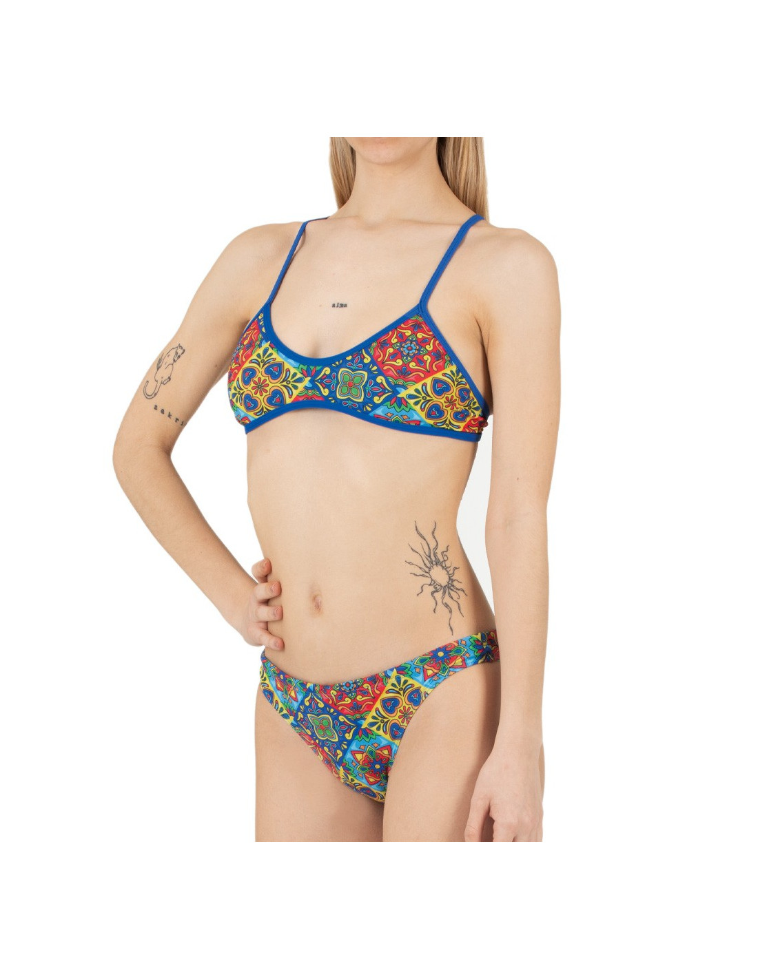 Entdecken Sie JULI, den zweiteiligen Damenbadeanzug, der Eleganz und Funktionalität in einem einzigartigen Design vereint. Gefertigt aus dem gefütterten Revolutional Shiro-Material, ist JULI dank seiner schmalen Passform, die für optimalen Tragekomfort sorgt, perfekt zum Schwimmen und Beachvolleyball geeignet. Das lebendige, farbenfrohe Fliesenmuster und die dünnen, überkreuzten Träger verleihen ihm einen Hauch von Stil, während das vollständig gefütterte Design und die herausnehmbaren Cups Vielseitigkeit und optimalen Halt bieten. Ob im Schwimmbad oder am Strand – JULI ist die ideale Wahl für alle, die einen Badeanzug suchen, der Leistung und Mode vereint.