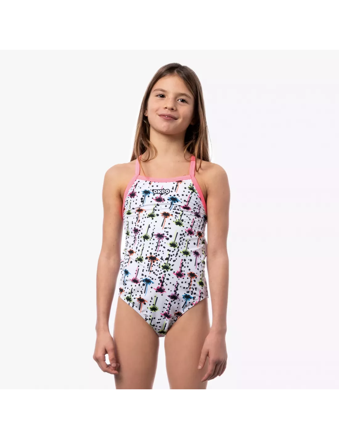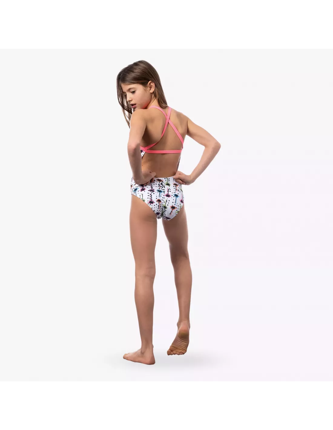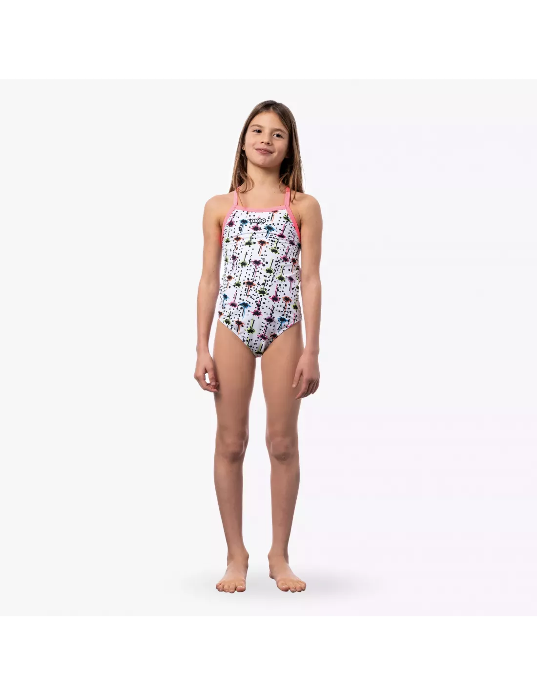 Der einteilige Badeanzug MALIBU für Mädchen mit farbenfrohem Muster auf weißem Grund und dünnen rosa Trägern ist aus Sydney Eco-Gewebe gefertigt, einem nachhaltigen Material, das Komfort und Langlebigkeit bietet. Er ist perfekt für den Sommer und vereint Stil und Umweltfreundlichkeit.