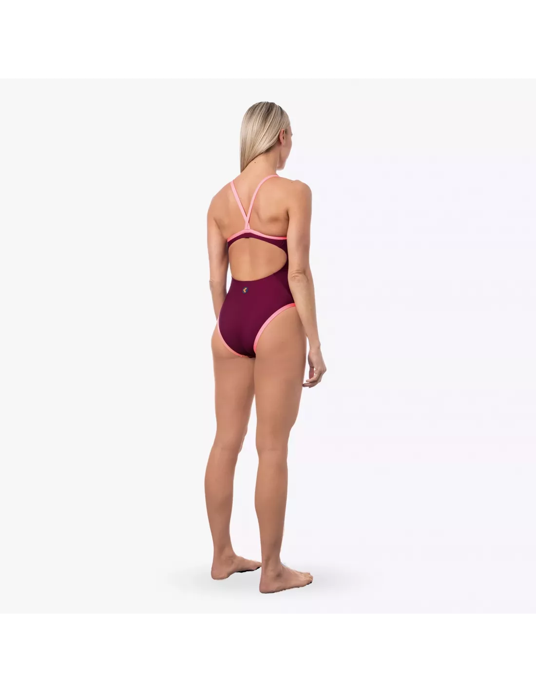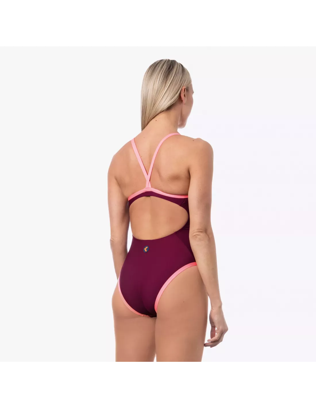 Der MELANIA FUN&FIT Badeanzug für Damen bietet dank des X-Play-Materials und des Innenfutters optimalen Halt für die Brust und hervorragenden Tragekomfort. Das bordeauxrote Design mit pinkfarbenem Besatz vereint Eleganz und Funktionalität für einen stilvollen Look am Pool.