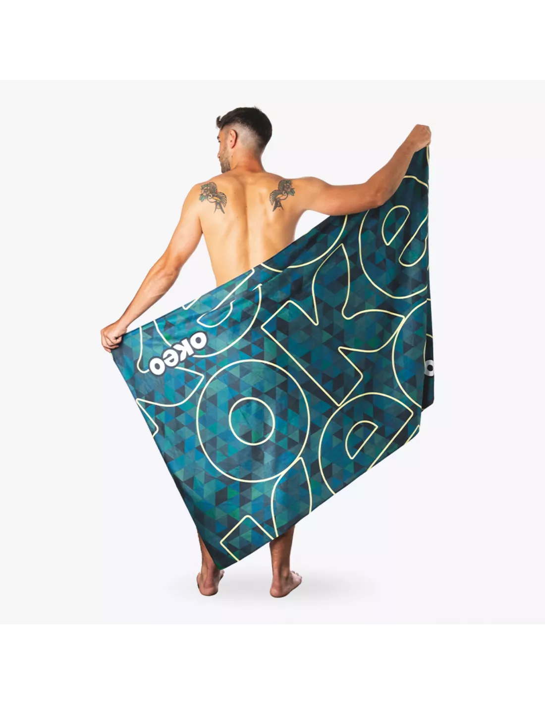 Dank seines Formats von 90 x 150 cm bietet es eine großzügige Fläche, ohne dabei sperrig zu wirken, während das graue geometrische Muster und das fluoreszierende Riesenlogo ihm ein modernes und unverwechselbares Design verleihen.