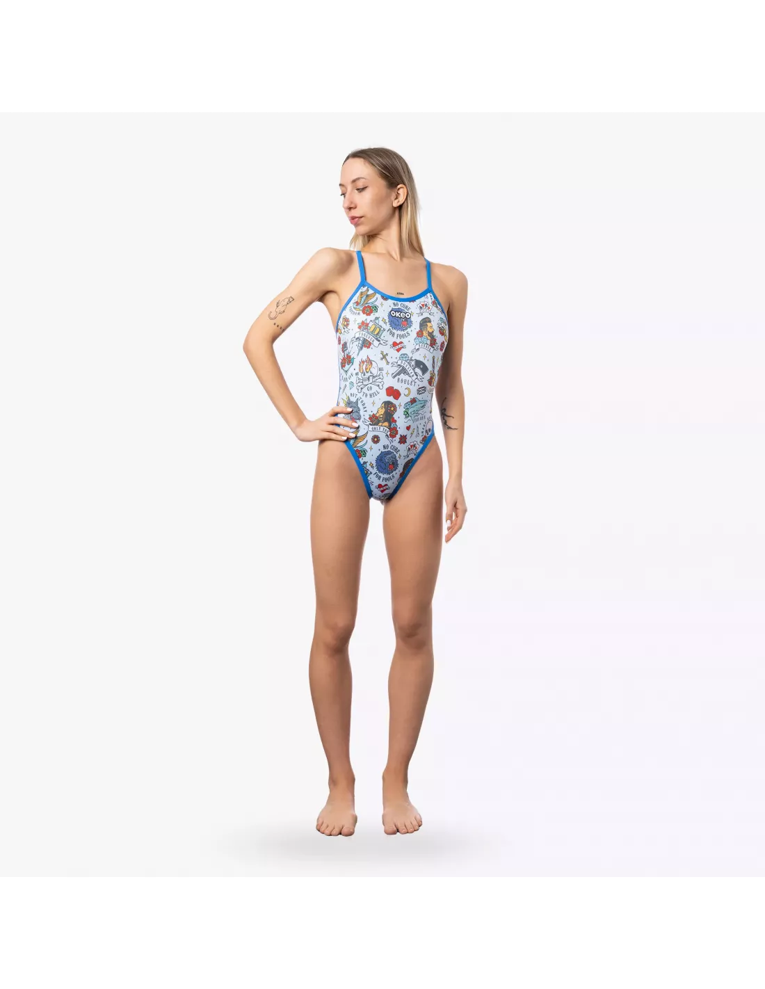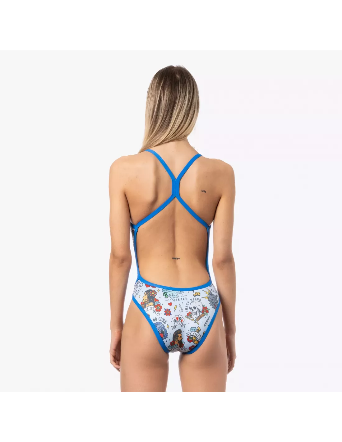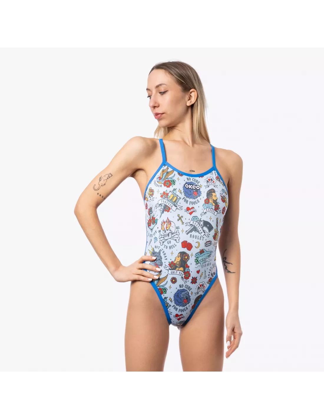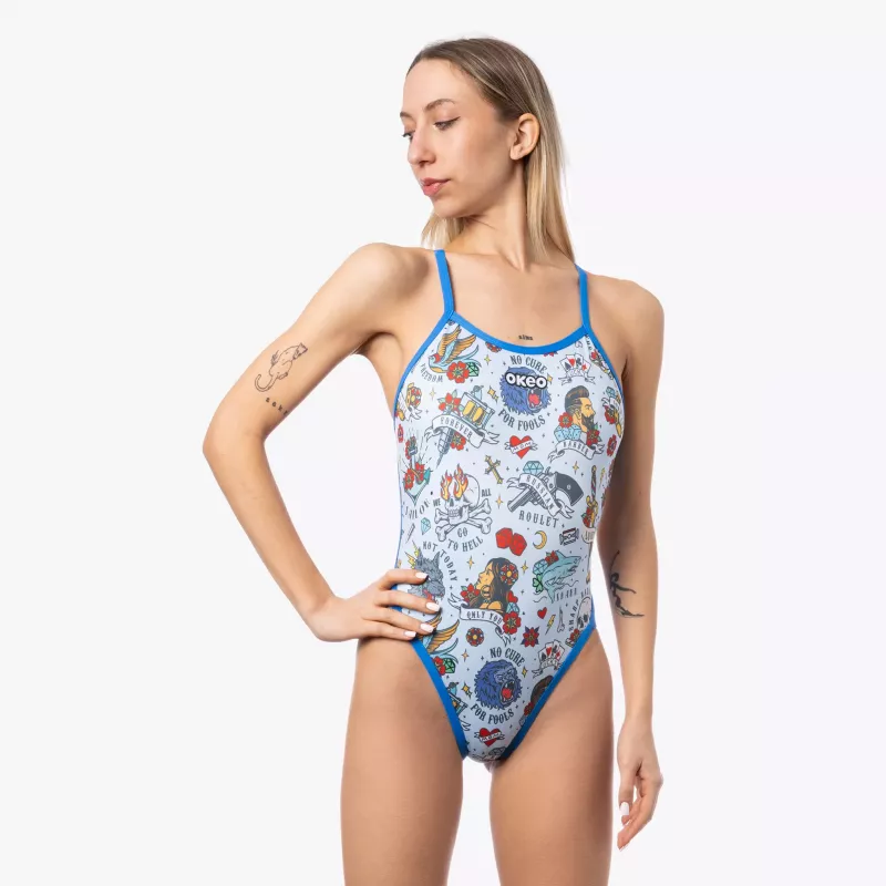 Der einteilige Badeanzug Oscar für Damen aus X-PLAY -Material besticht durch ein Tattoo-Muster im Retro-Stil auf hellblauem Grund und schmale hellblaue Träger. Er ist gefüttert, komfortabel und bietet Stil und Funktionalität für jeden Tag am Pool.