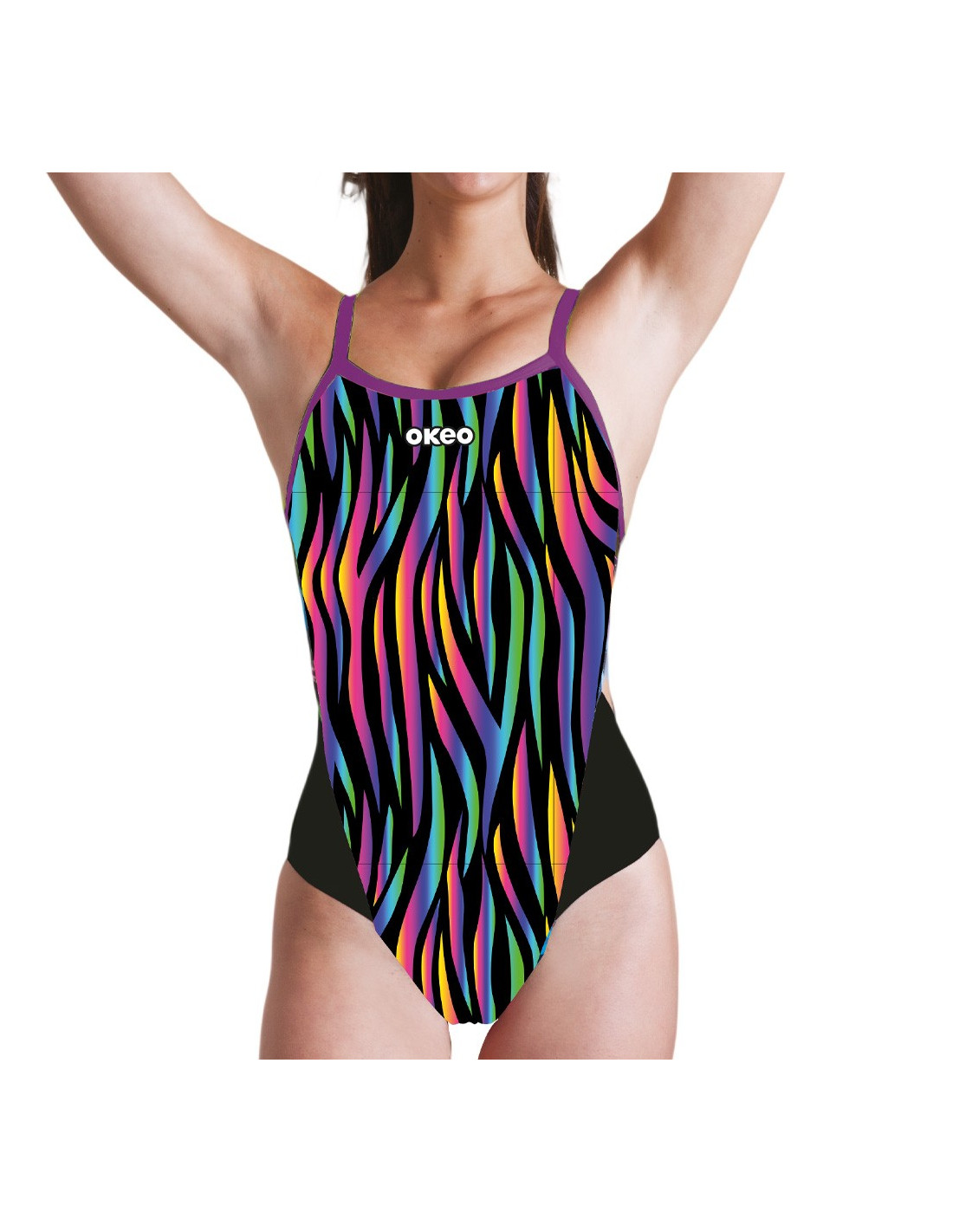 Produktcode: A0102ODer SAFARI-Einteiler mit seinem farbenfrohen, von der Savanne inspirierten Muster und den schmalen, violetten Trägern vereint dank des X-Play-Materials Stil und Komfort. Perfekt für ein elegantes und lebendiges Schwimmerlebnis.