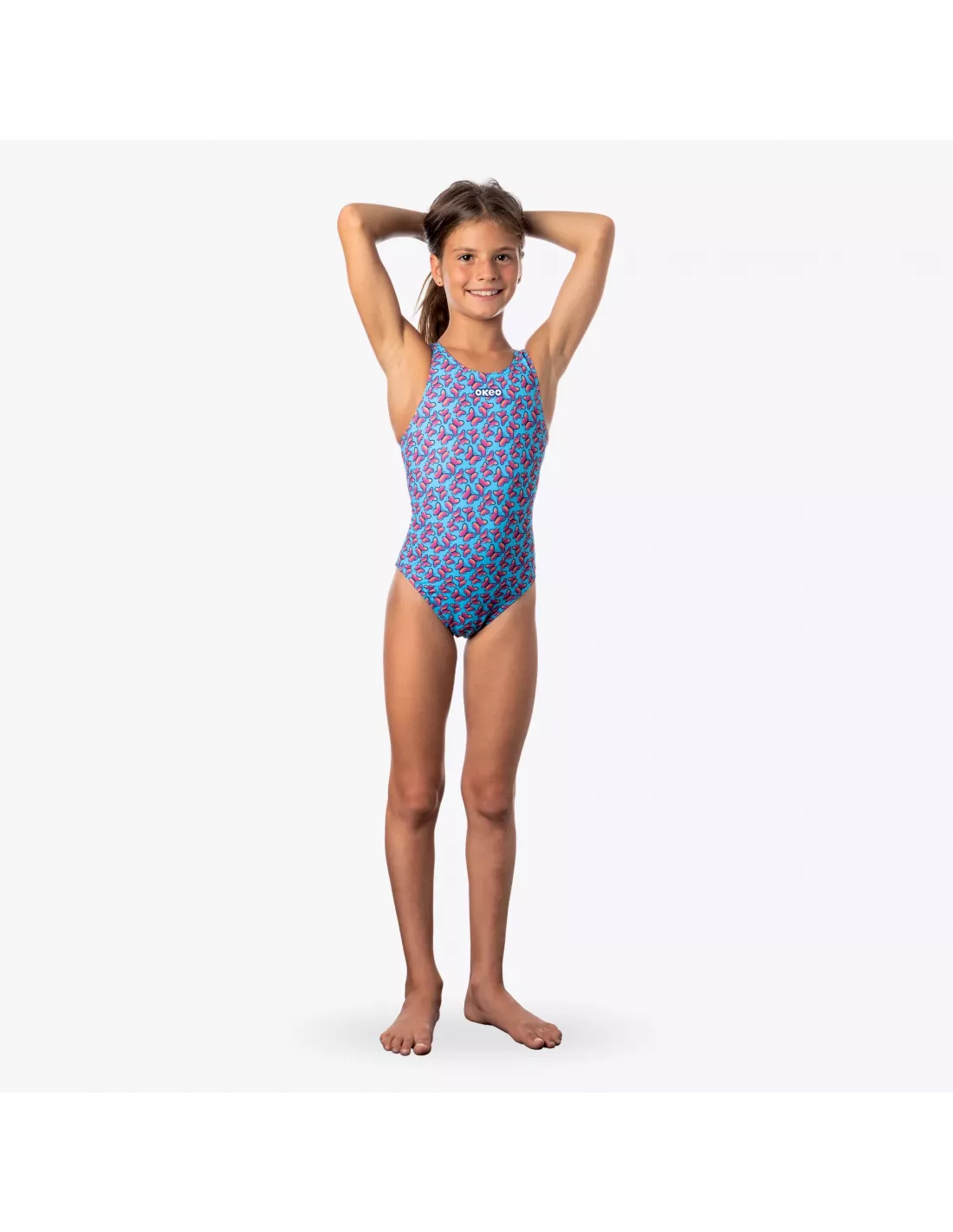 Der einteilige Badeanzug LACE für Mädchen mit hellblauem Okeo-Logoprint vereint Stil und Komfort. Hergestellt aus Sidney Eco-Gewebe , ist er chlor- und UV-beständig und somit ideal für Pool und Strand.