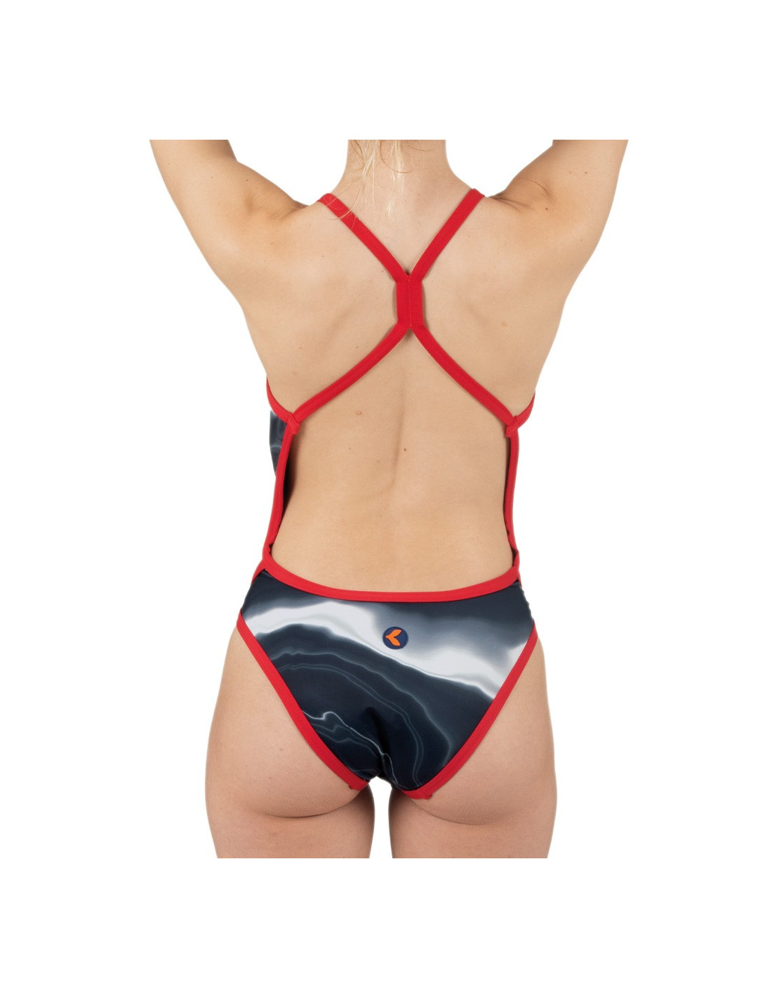 Der TRUENO Badeanzug vereint Eleganz und Funktionalität mit einem schwarz-weißen Muster und schmalen roten Trägern. Gefertigt aus gefüttertem X-Play-Material, garantiert er Komfort, Langlebigkeit und eine perfekte Passform für jedes Schwimmtraining.