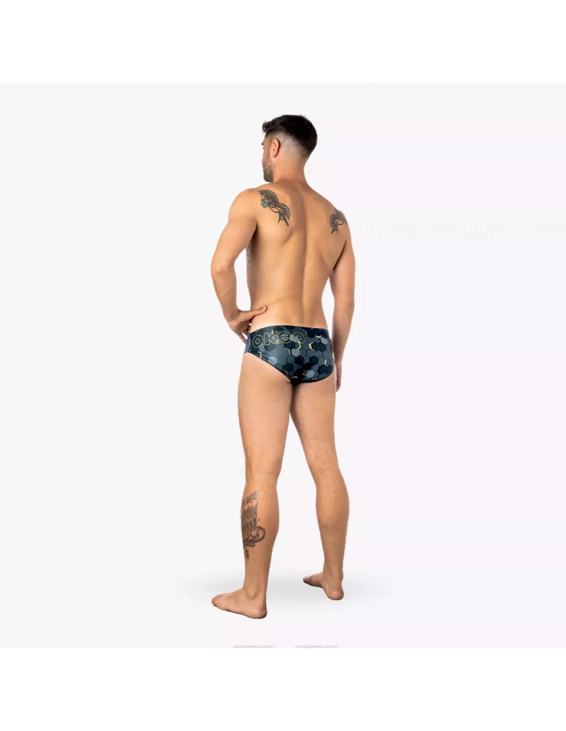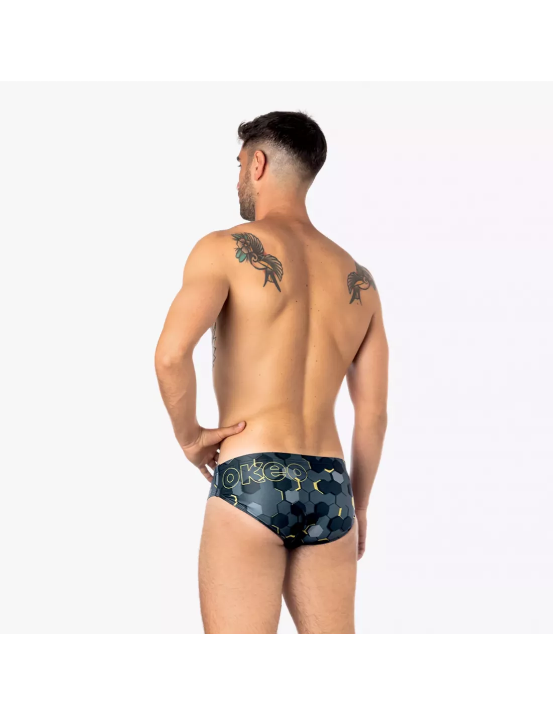 Codice prodotto: A2101ZMONTREAL men's briefs from the FW collection, in lined Sidney Eco fabric , with a gigalogo pattern on a gray geometric background . 8 cm fit, bold style and optimal comfort for the beach and pool.