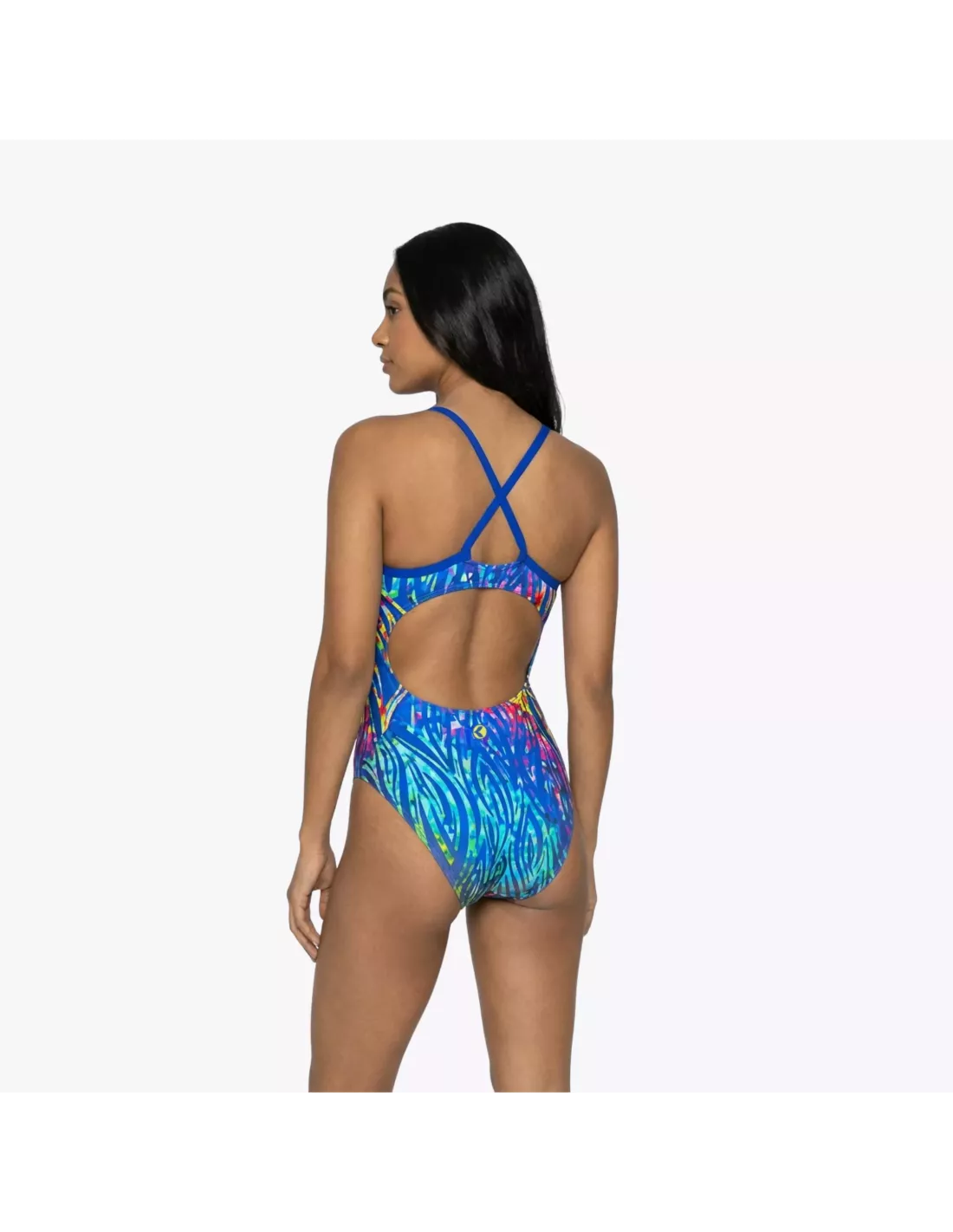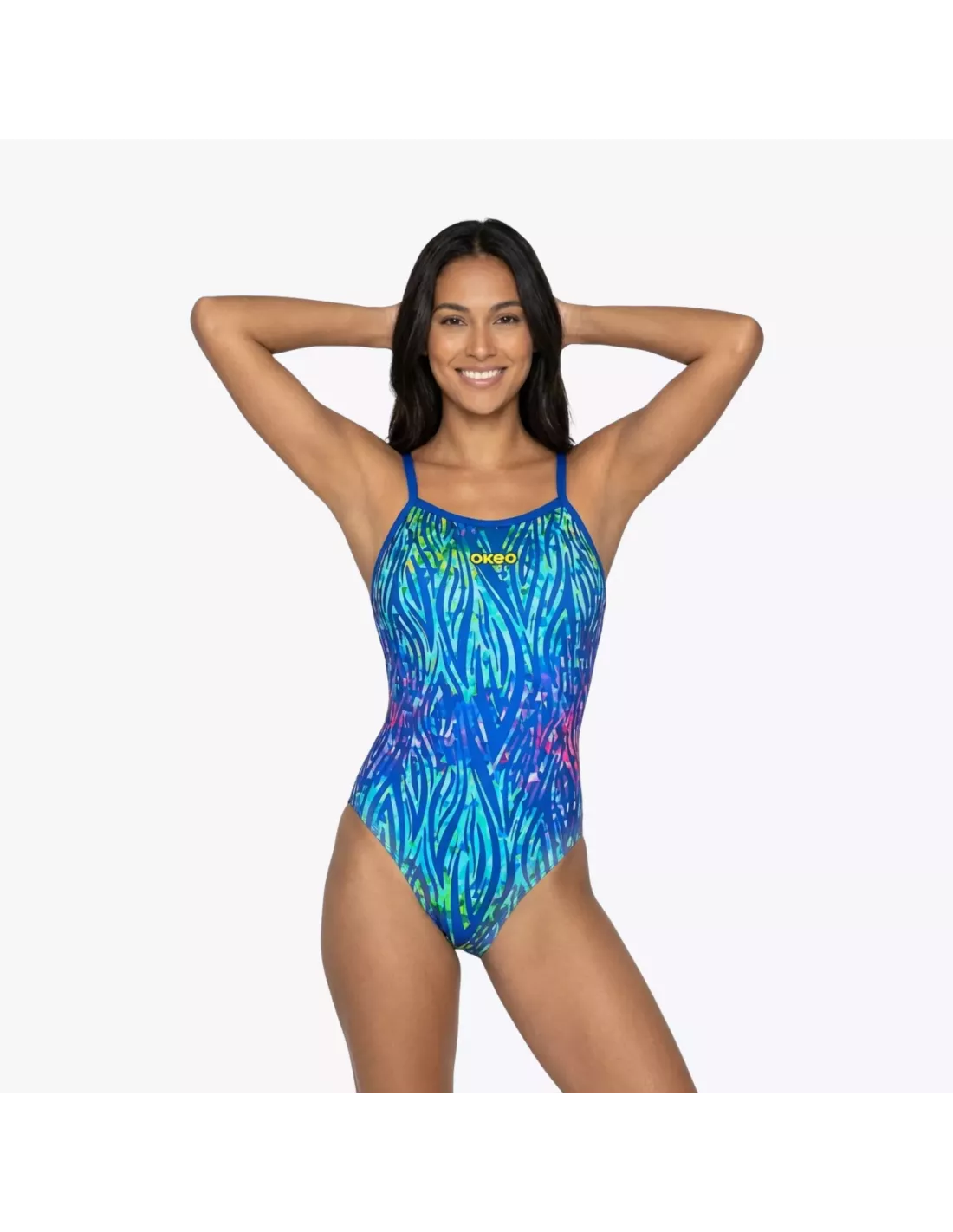 Brighten up every swim with NORA , the one-piece swimsuit designed to combine style and performance. The zebra print in royal and green tones creates a bold and modern look, complemented by narrow straps that enhance the sporty and feminine design.