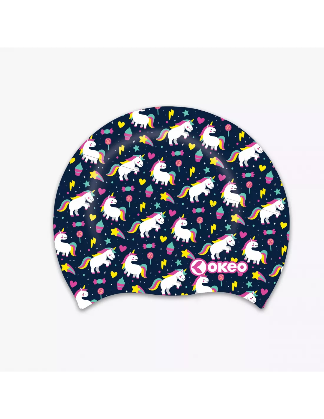 Code produit: AK003GLe bonnet en silicone UNO arbore un motif licorne coloré sur fond bleu : résistant, extensible et confortable. Idéal pour l'entraînement et les loisirs en piscine, il allie praticité et style.