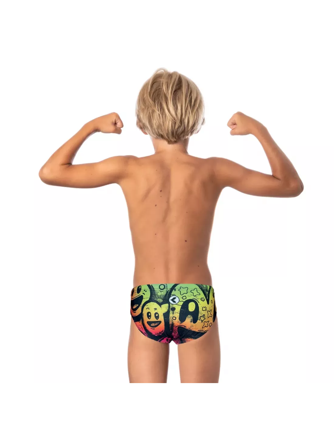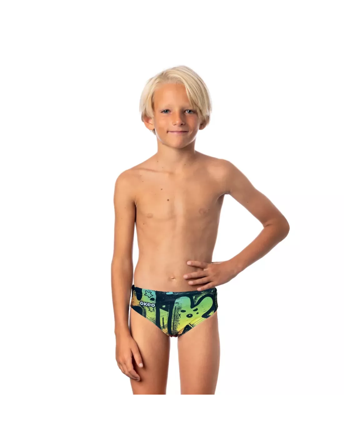 Le maillot de bain BRIXTON est un slip pour garçon orné d'un imprimé graffiti urbain, idéal pour apporter couleur et énergie à la plage ou à la piscine.