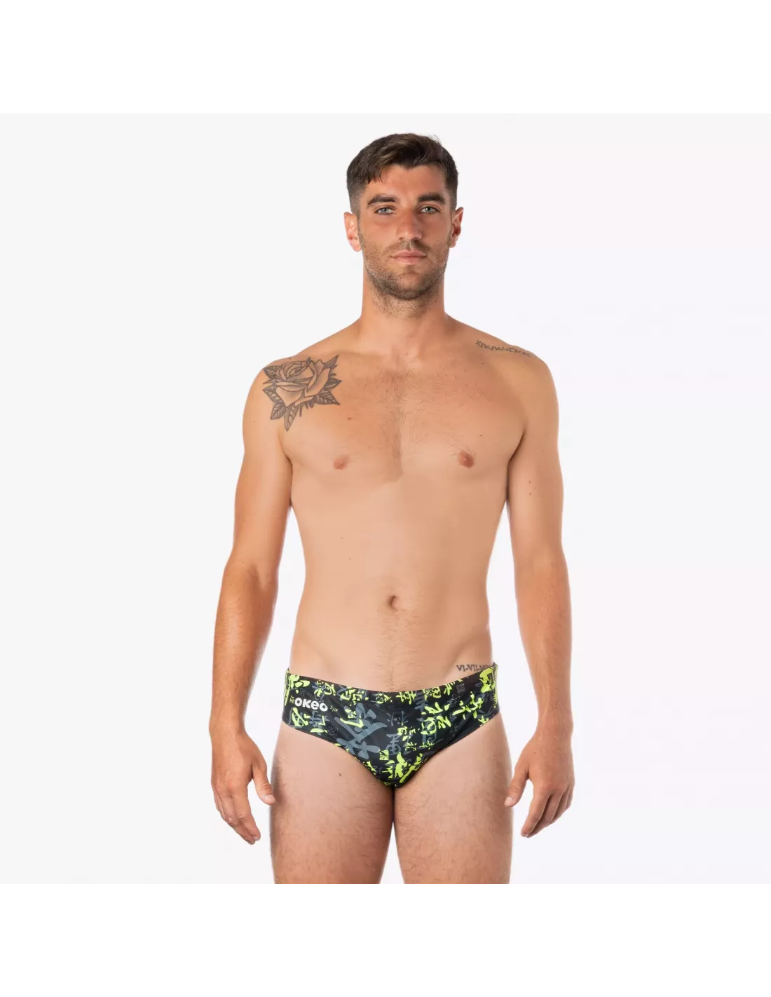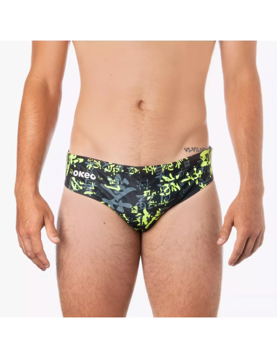 Code produit: A21024Slip homme TAIPEI en tissu Sidney Eco , doublé et avec une hauteur de hanches de 8 cm. Design sportif avec inscription japonaise jaune fluo pour un style unique et contemporain.