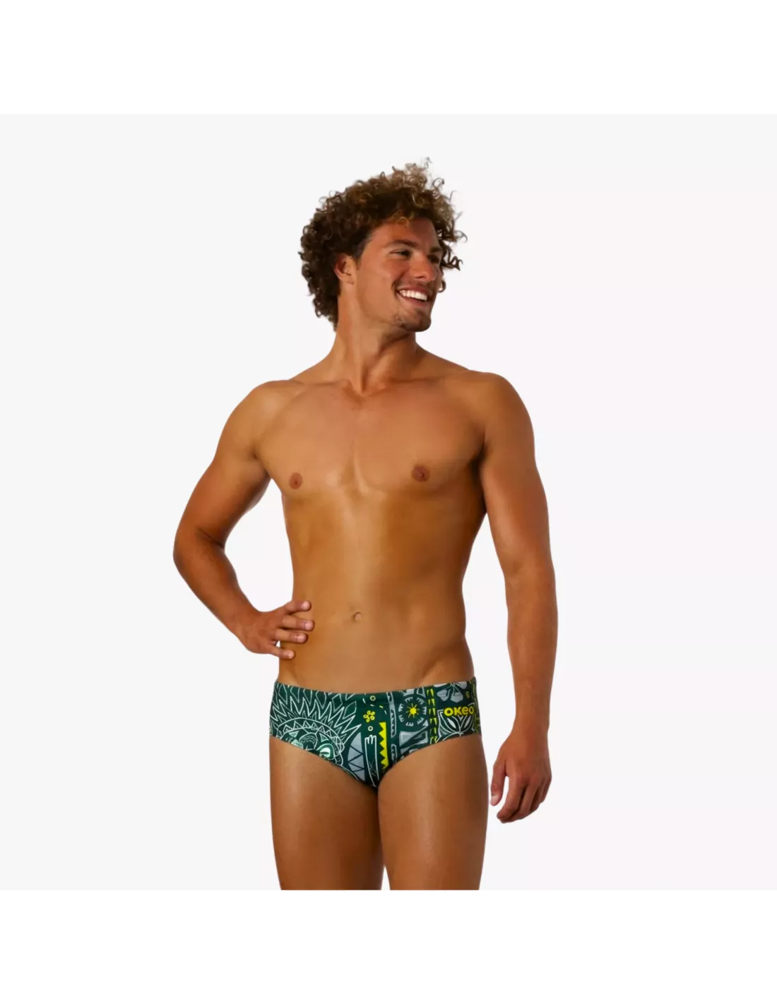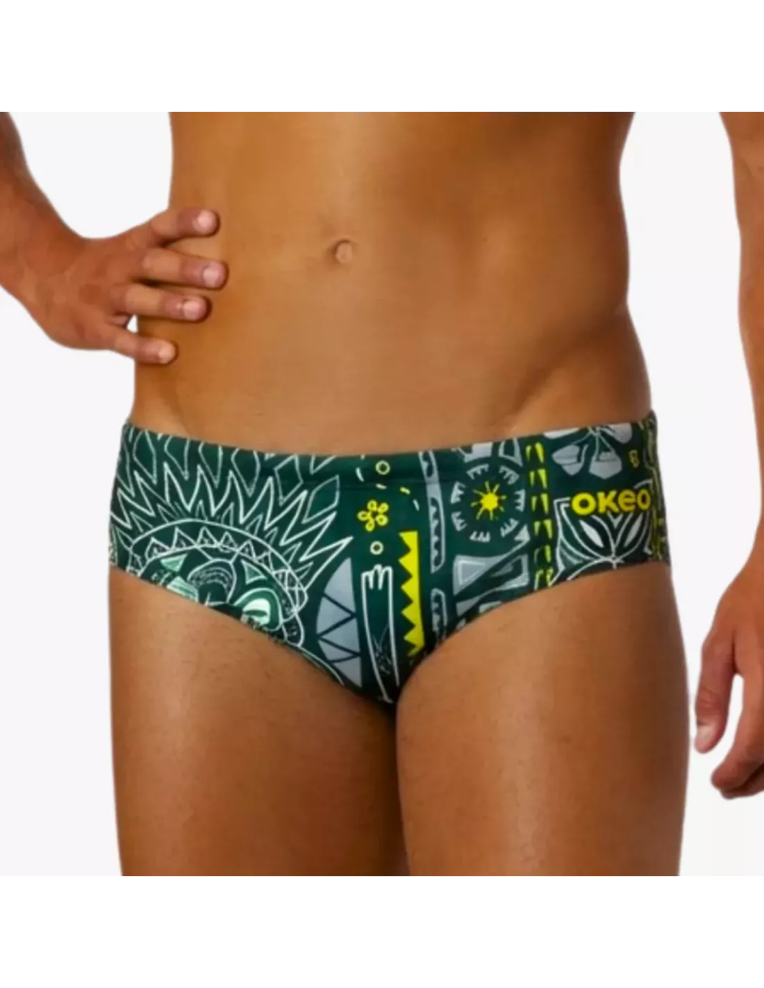 Avec une hauteur de hanche de 7,5 cm , ce slip de bain offre une coupe moderne et dynamique, idéale pour celles et ceux qui privilégient une ligne épurée et performante. Son motif tribal vert lui confère un caractère audacieux et énergique, parfait pour celles et ceux qui souhaitent afficher un style distinctif et contemporain dans l'eau.