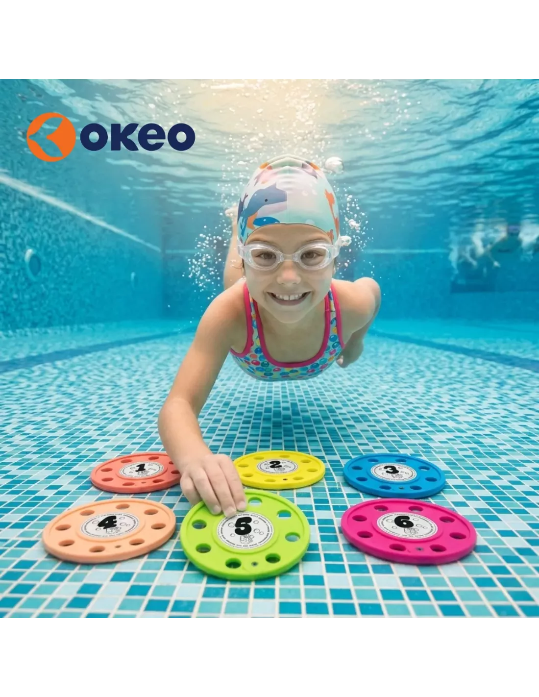 Codice prodotto: TQ2100I DIVE DISCS OKEO sono 6 dischi numerati autoaffondanti progettati per rendere divertente l'ambientamento in acqua, aiutando i bambini a imparare a immergersi in sicurezza. Utilizzabili sotto il controllo di personale qualificato, sono ideali per piscine e attività acquatiche.