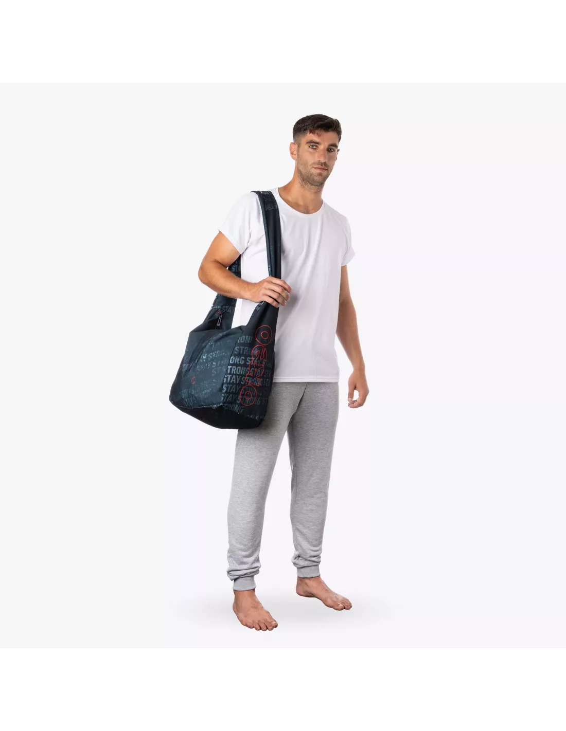 Realizzata in tessuto robusto, presenta una vivace fantasia “Stay Strong” su fondo grigio che trasmette energia e motivazione. Leggera e pratica da trasportare, grazie ai manici resistenti, si adatta perfettamente a ogni occasione sportiva.