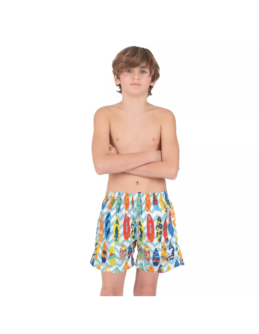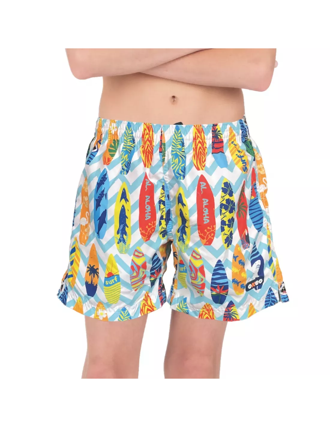 Codice prodotto: A7300GBoxer ALOHA con fantasia di tavole da surf colorate su fondo blu, perfetto per un look estivo giovane e vivace.