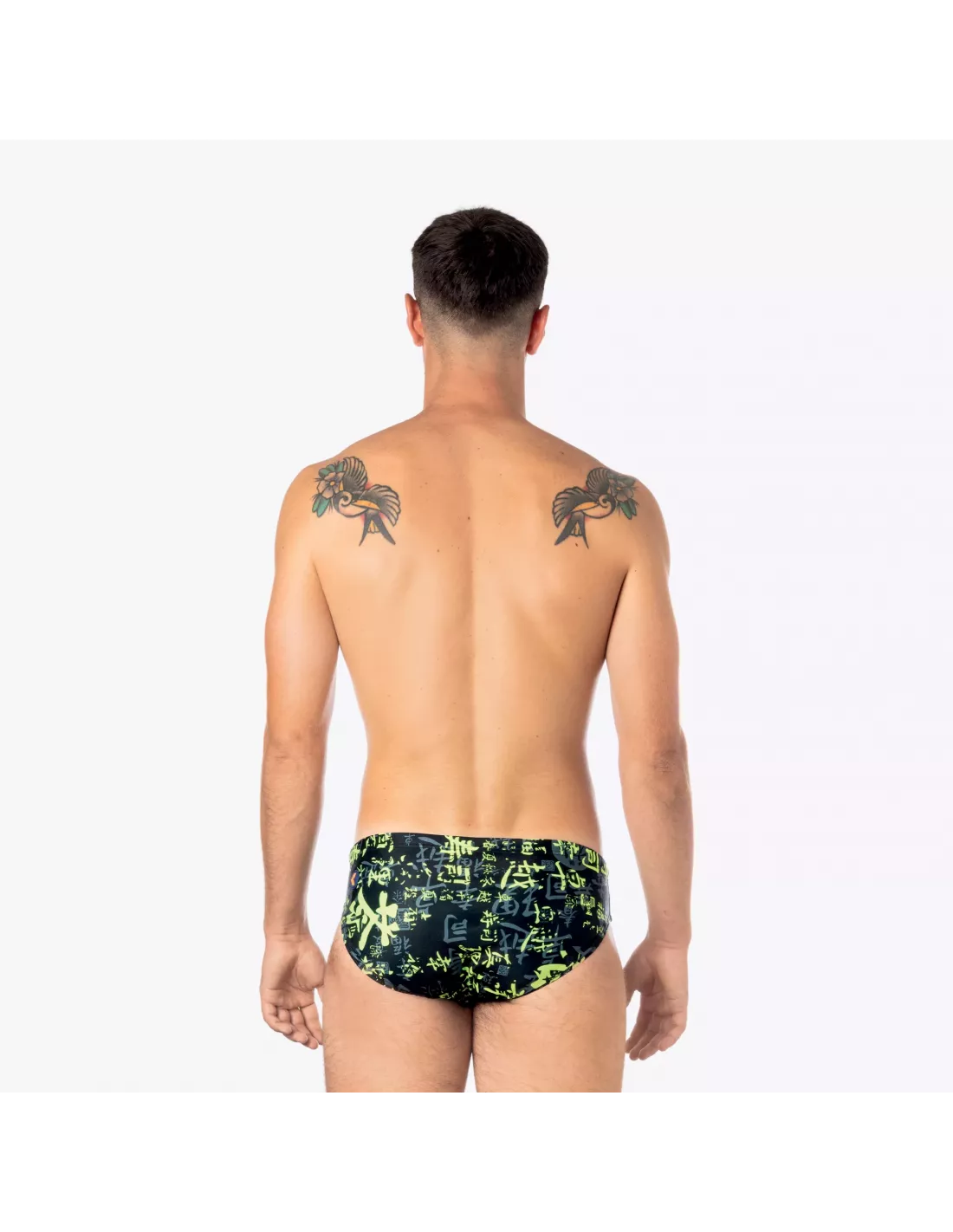 Codice prodotto: A21024Slip uomo TAIPEI in tessuto Sidney Eco, foderato e con altezza fianco di 8 cm. Design sportivo con scritte giapponesi in giallo fluo per uno stile unico e contemporaneo.