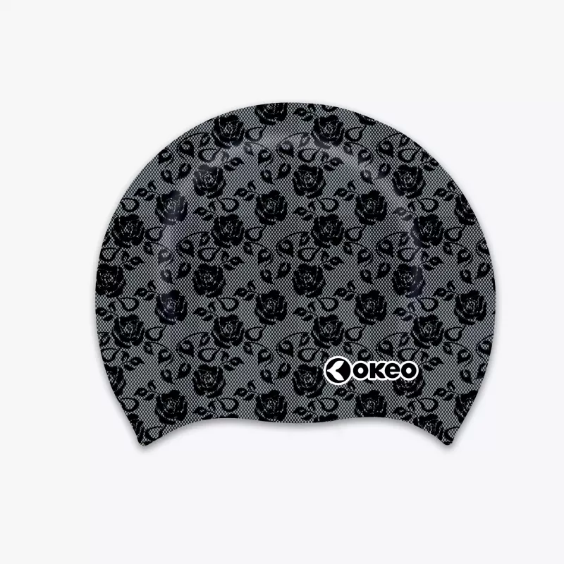 Cuffia da nuoto in silicone TEA, resistente e confortevole, ideale per allenamenti e nuoto ricreativo. Design elegante con rose nere su fondo grigio per distinguersi anche in piscina.