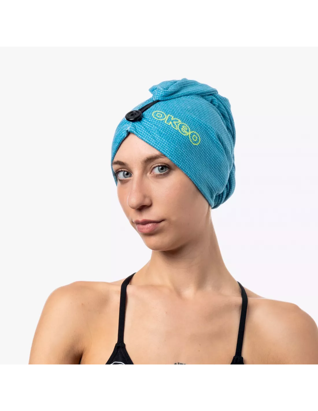 Turbante in microfibra di poliestere super-assorbente per asciugare i capelli bagnati dopo la nuotata in modo rapido e delicato, riducendo l'effetto crespo. Fissaggio stabile grazie al pratico bottoncino.