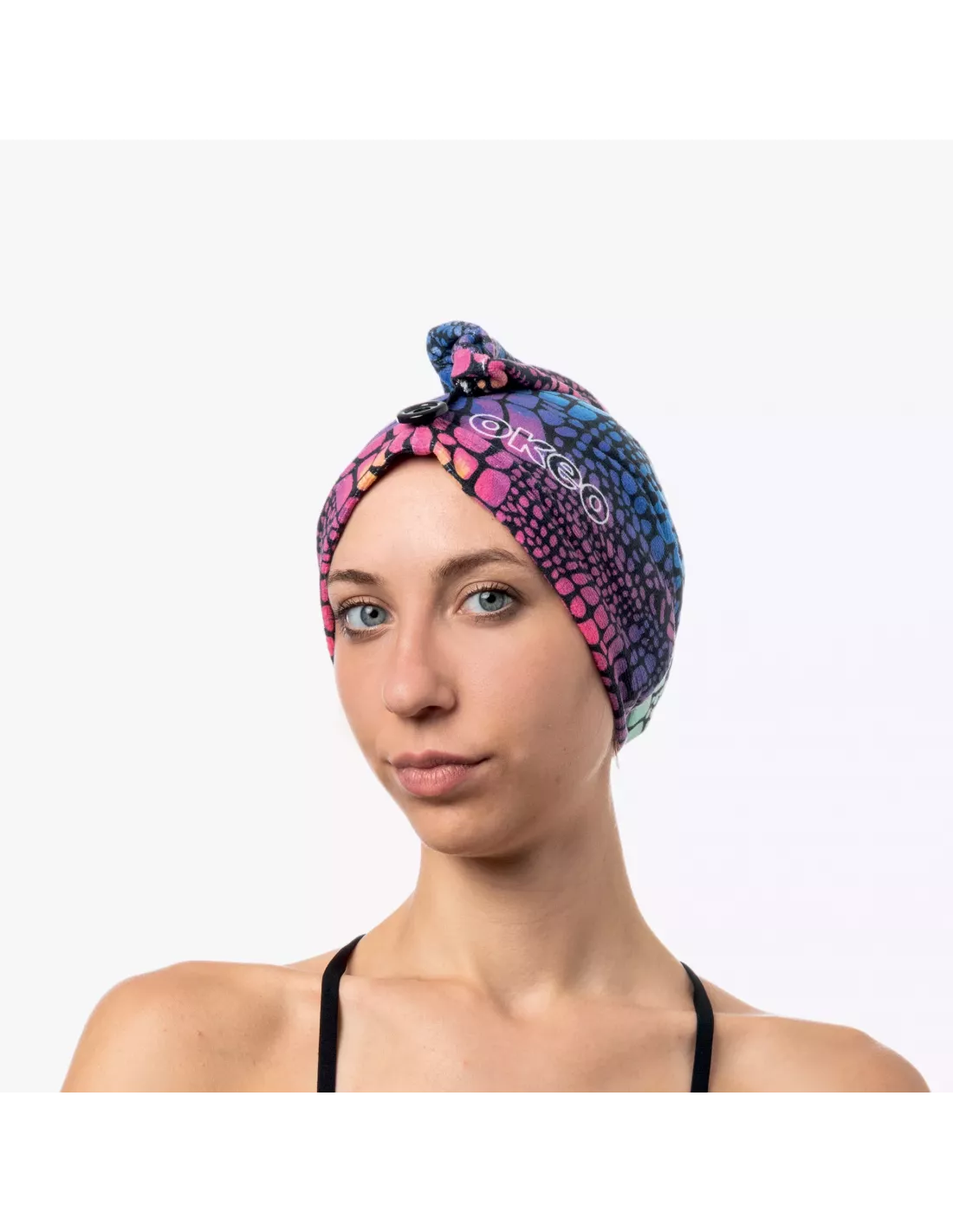 Turbante in microfibra di poliestere super-assorbente per asciugare i capelli bagnati dopo la nuotata in modo rapido e delicato, riducendo l'effetto crespo. Fissaggio stabile grazie al pratico bottoncino.